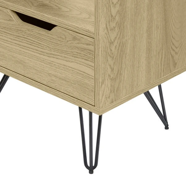 This Bella 1 Drawer Bedside Oak Effect is a great place to store your bits and bobs. The oak effect finish and black metal hairpin legs add a classic look that will complement any room in the house.