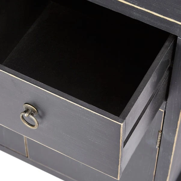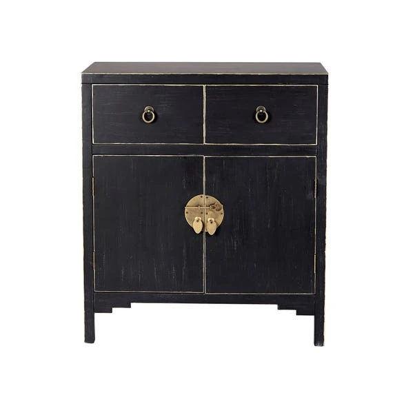 Featuring a beautiful Chinese-inspired design, the Hanna chest is a versatile storage solution that will add a unique touch to any room. Designed with a beautiful distressed black finish and contrasting gold edges, this exquisite chest features traditional Chinese style handles with a loose pin lock mechanism and rustic gold finish.