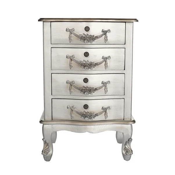 Rival the Palace of Versailles with Toulouse. Even though you may not be royalty, fake it till you make it, right? The intricately carved drawer fronts and cabriole legs of our Toulouse bedside take their inspiration from vintage Parisian-chic. The painted finish combined with contrasting metal handles gives a more modern twist to the classic. The 4 drawers provide plenty of storage space, making this chest ideal for all rooms in your home – bedroom, office, living room or hallway.