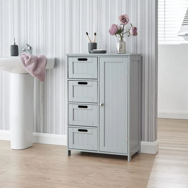 An elegant yet functional addition to your home, this self-assembly bathroom storage unit is ideal for keeping your home tidy and organised. With a contemporary white finish this solid pine storage unit will give you plenty of room to store away bathroom essentials with four large drawers, and a cupboard with a storage shelf inside. It will look good in any home with its simple style and is both functional and durable, made with a solid construction.