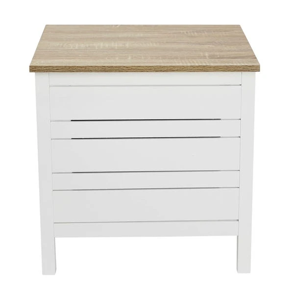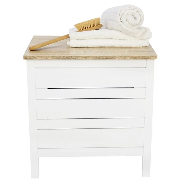 Fitted with a light oak effect hinged lid, this white laundry hamper has a slatted design at the front, is crafted with side carrying handles, and is quickly and easily assembled. This hamper features one hinged door.