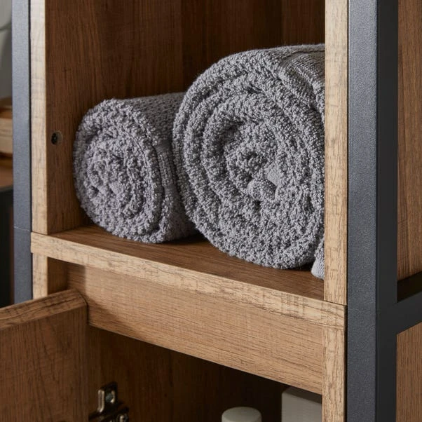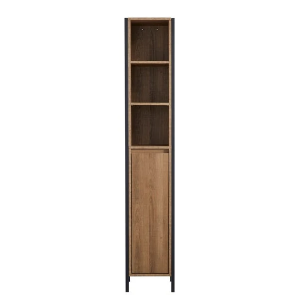 Boasting an oak effect and black metal frame this Tall Cabinet gives your bathroom an ultra-modern touch whilst also proving you with ample storage space. With three display shelves, you can display all your favourite toiletries, ornaments, plants or bathroom essentials whilst its two internal shelves mean you can neatly and discreetly organise all your other bathroom bits and bobs. This Tall Cabinet features a handle-free design and 6 shelves for ample storage space. This door opens from right-left.