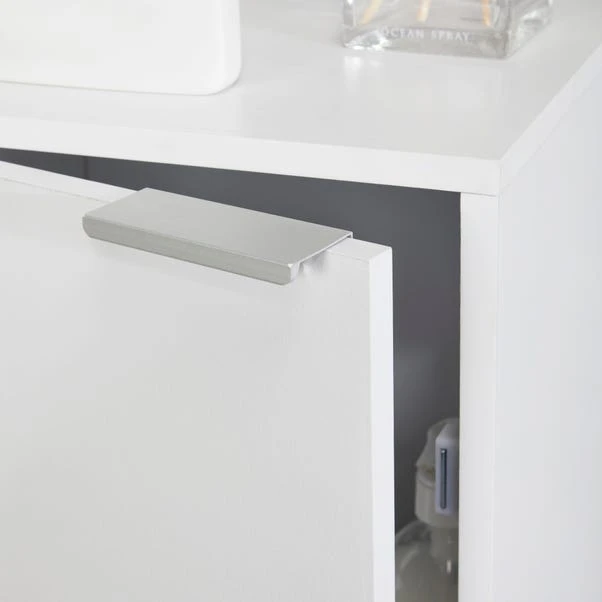 Boasting a crisp, clean satin finish, this Jaxon Floor Cabinet is ideal for keeping your bathroom neat and tidy. Made from durable MDF and with stylish chrome handles, this cabinet is strong, versatile, and easy to assemble. This sleek cabinet features ample, adjustable storage space and shelves inside so you can organise all your bathroom essentials easily. This cabinet features a timeless white design that would compliment any bathroom interior beautifully. This item can be coordinated with other items from the Jaxon Range.